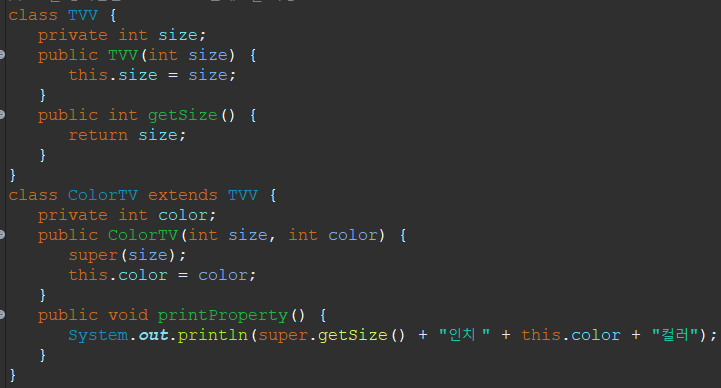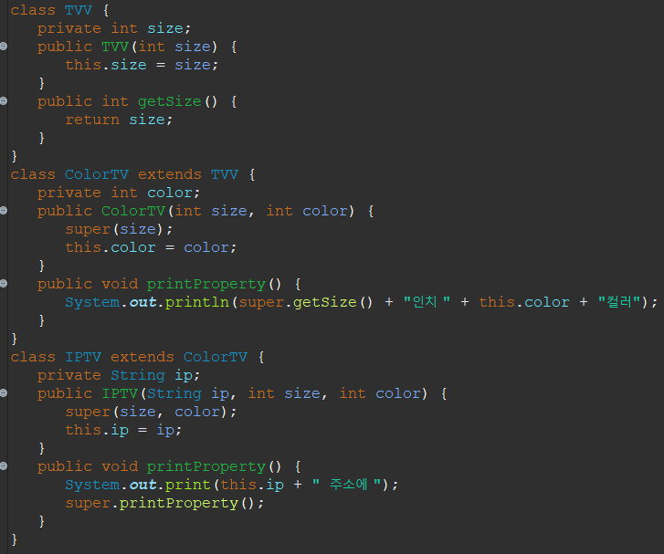 [2번] 다음 main() 메소드와 실행 결과를 참고하여 ColorTV를 상속받는