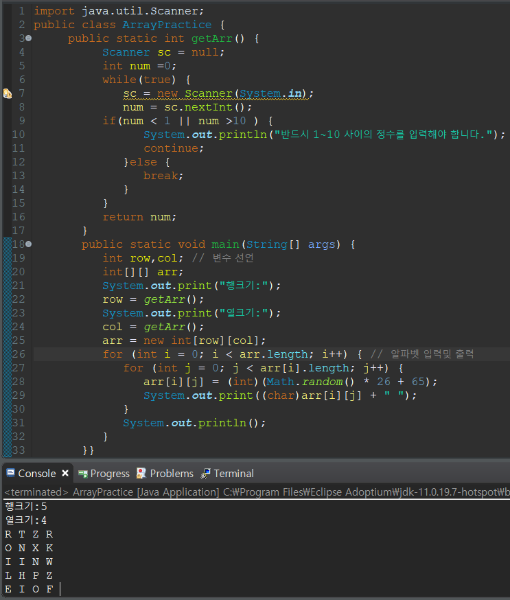크기가 정해진 이차원 배열 안에는 영어 대문자가 랜덤으로 들어가게 한 뒤 출력하세요.