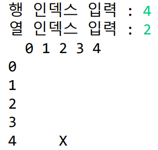 그리고 사용자에게 행과 열을 입력 받아 해당 좌표의 값을 'X'로 변환해 2차원 배열을 출력하세요.
