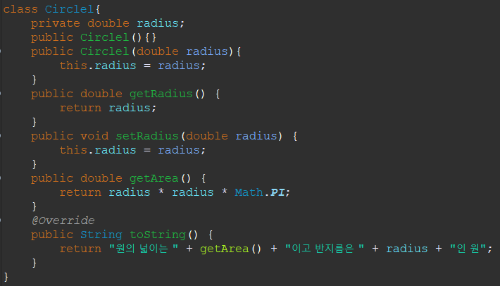 System.out.println(circle); //원의 넓이는 314.1592 이고 반지름은 10 인원