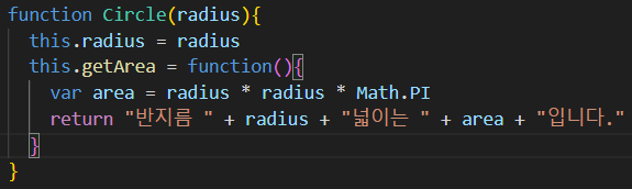 document.write(circle.getArea()); //반지름 10 넓이는 314.1516 입니다.