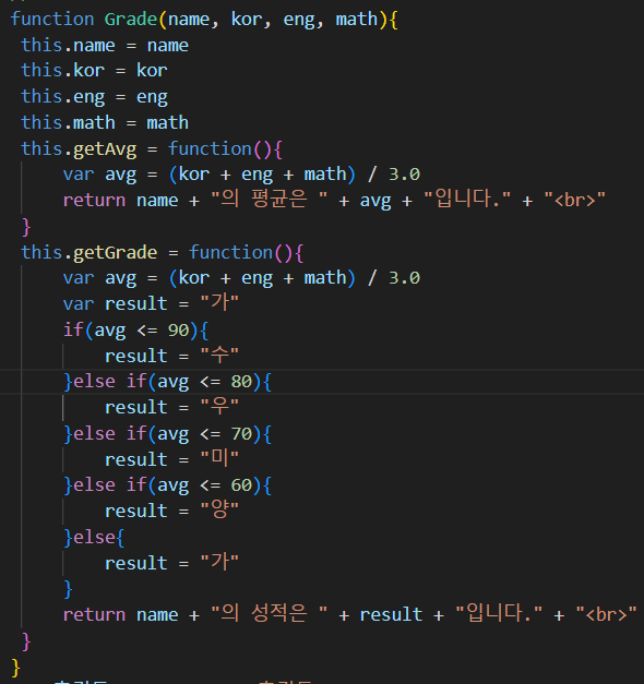 document.write(홍길동.getGrade());// 홍길동의 성적은 미 입니다.
