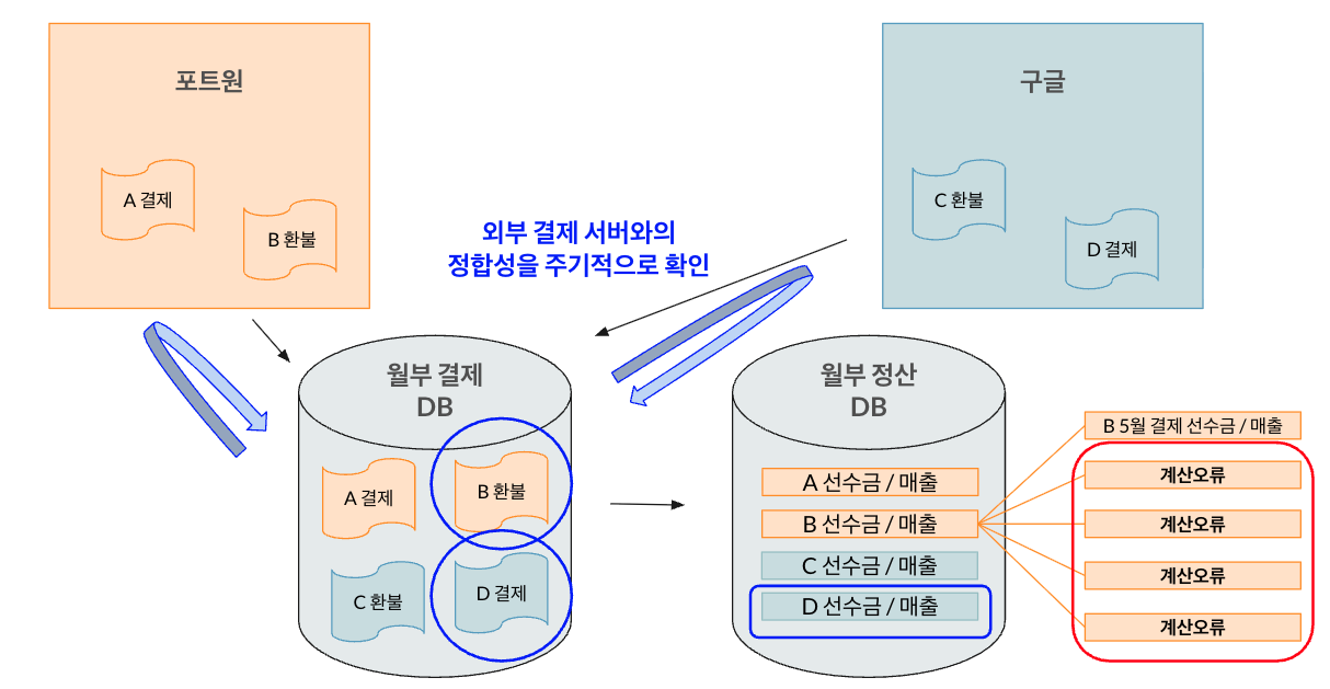 우선 대사배치를 통해 외부 결제와 내부 DB의 데이터 정합성을 확보할 수 있었다.