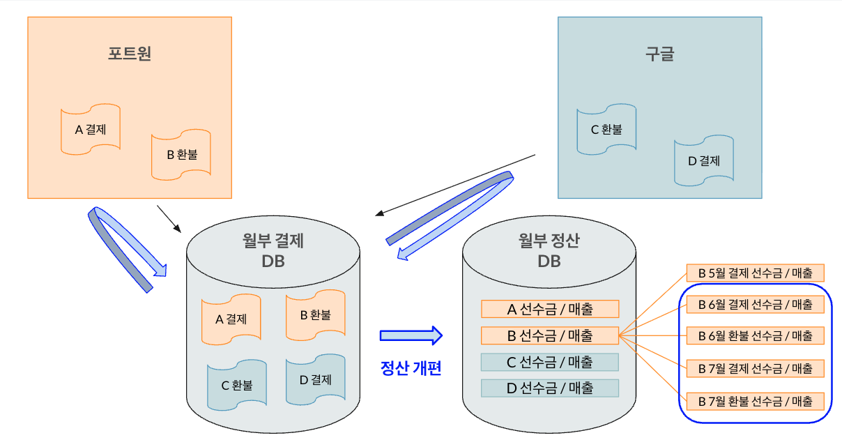 회사 성장과 함께 다양한 상품과 결제수단(구글 인앱, 베네피아 포인트, 애플 제3자 결제, 유튜브 쇼핑 등)이 추가되었다. 기존 SQL 기반 구조는 이를 감당할 수 없었고, 새로운 케이스마다 수동 정산이 필요했다. 특히 상품권 같은 신규 상품은 기존 강의와 다른 선수금/매출 인식 기준을 가졌기에, 지속적으로 확장 가능한 구조가 필수였다.