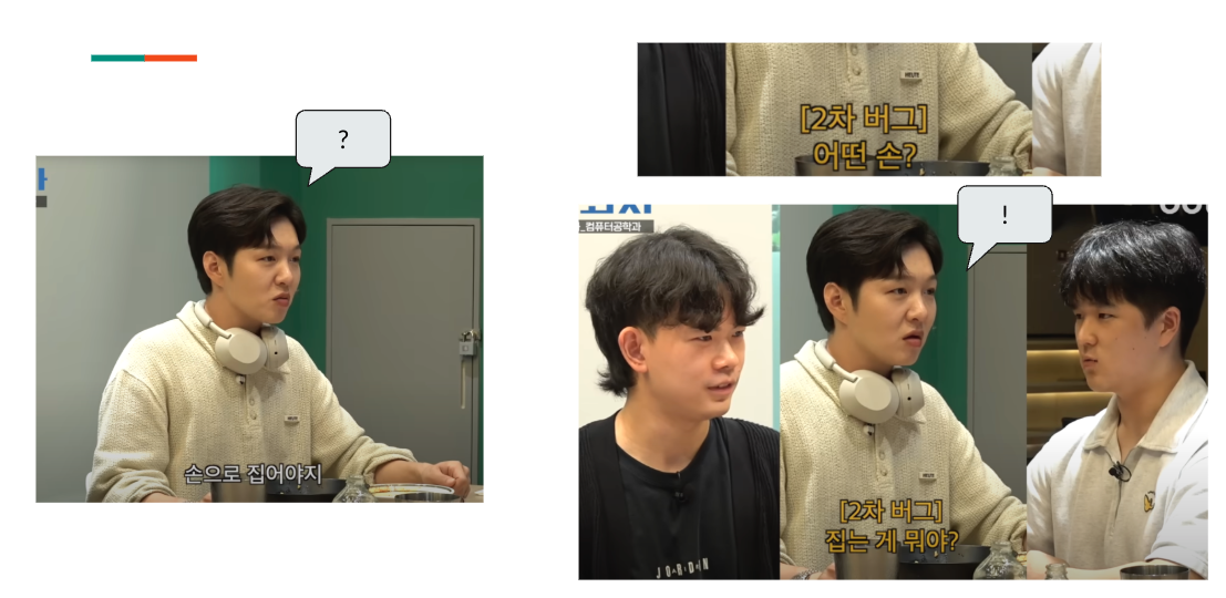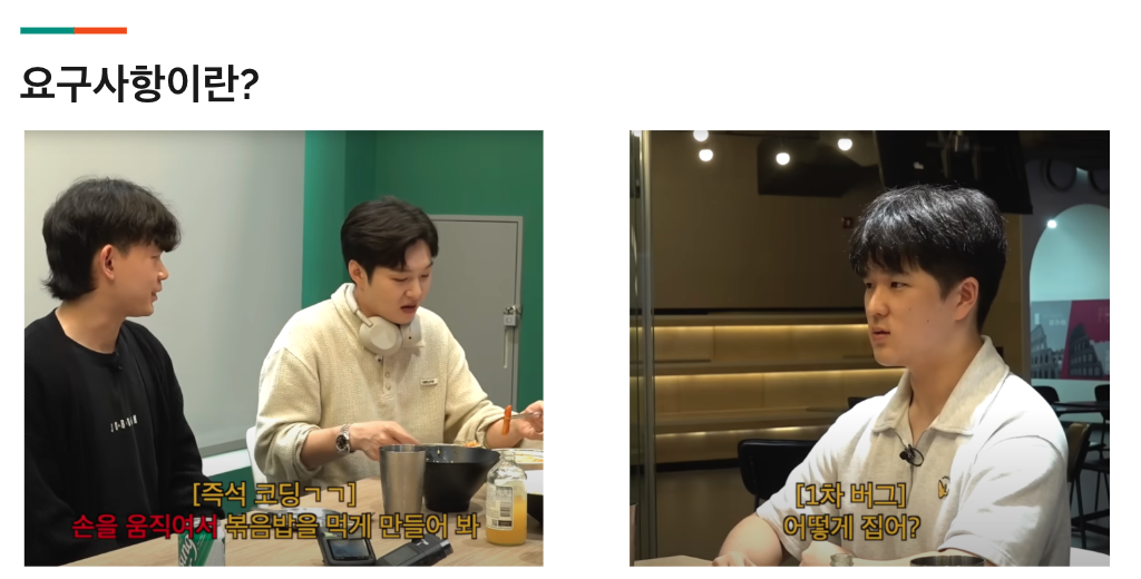 그러나 문제를 제대로 해결하기 위해서 개발자와 소통하는 과정에서 어떠한 것이 필요한지 이해하는 것은 모두를 위해 필요하다고 생각한다. (PM/PO 분들 정말 리스펙합니다..) 이를 설명하기 위해 유튜브 전과자의 영상을 캡쳐하여 발표를 진행했는데, 이 부분에서 개발, 비개발 파트 모두 공감을 많이 느끼셨던 것 같다 ㅎㅎ