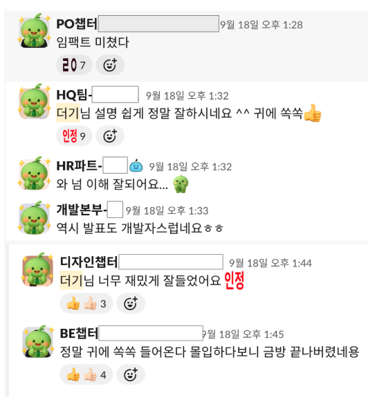 발표가 끝나고 임직원분들이 직접 말씀으로, DM으로 소중한 피드백을 주셔서 매우 감사했다. 슬랙에서 응원도 많이 해주셔서 더욱..! 감사했다.