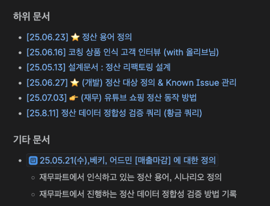 월부에는 별도의 정산팀이 존재하지 않았고, 개발자들이 다른 프로젝트들과 달리 비즈니스 규칙에 대한 깊은 이해 없이는 코드만으로 문제를 파악하기 어려웠다. 이를 고려해 프로젝트가 마무리된 직후, 개발하며 정리했던 도메인 지식과 기술 문서를 체계화하여 향후 담당자가 빠르게 컨텍스트를 이해할 수 있도록 정리해두었다.