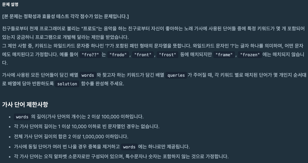 문제 조건을 보면 가사 단어는 중복되지 않으나, 검색 키워드는 중복될 수 있다고 합니다. 따라서 처음에는 같은 검색 키워드만 10만개가 주어지는 경우 캐싱을 활용하면 효율적으로 문제를 해결할 수 있겠다는 생각이 들었습니다.
