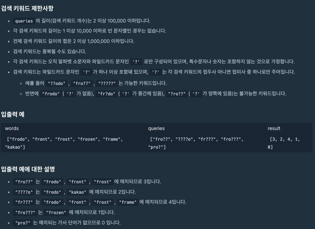 * 0. 단어와 쿼리 갯수는 10만, 단어의 길이 자체가 1만 이하로 / 해당 단어가 쿼리에 적절한지 비교하는 경우는 O(N)으로 들어가도, 단어 탐색은 log(N)으로 해결해야 한다 -> 이분 탐색