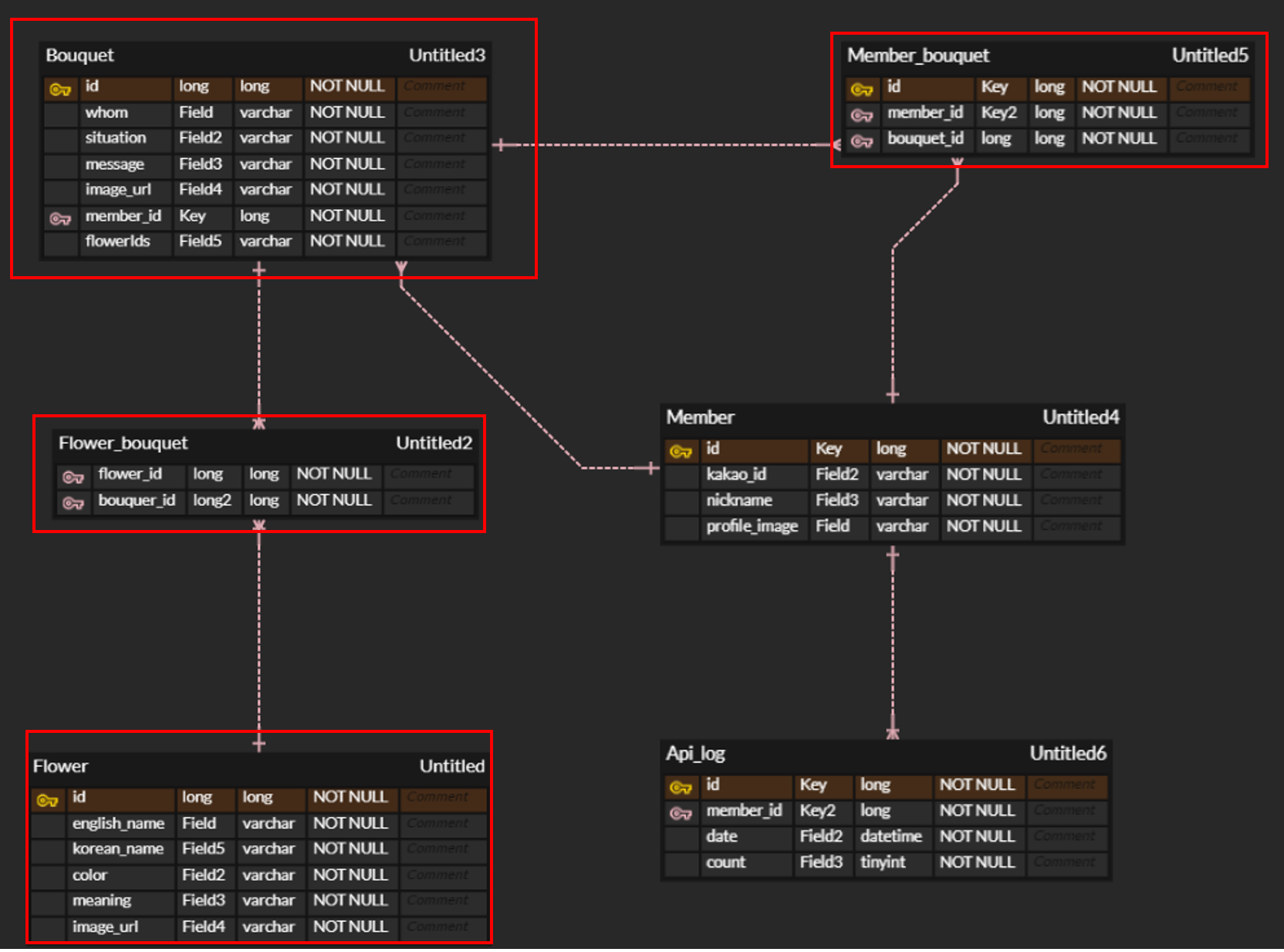 원래는 bouquet 테이블에 필드로 꽃 id를 비정규화하여 가지고 있을까까지 생각했으나, 어자피 검색 조건에 꽃의 정보가 들어가있기 때문에 join되는 레코드 수를 줄이기 위해 꽃 id만 가지는 것은 무의미하다고 판단했다.