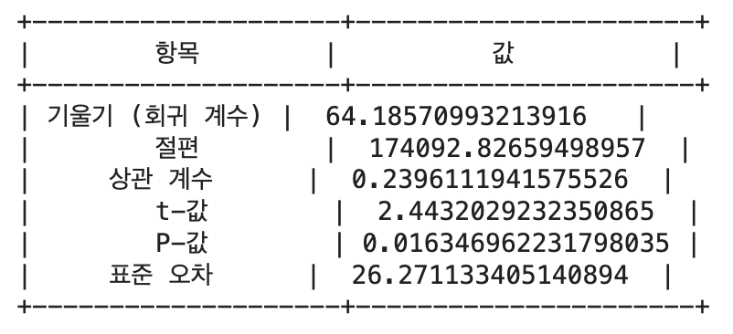 "항목": ["기울기 (회귀 계수)", "절편", "상관 계수", "t-값", "P-값", "표준 오차"],