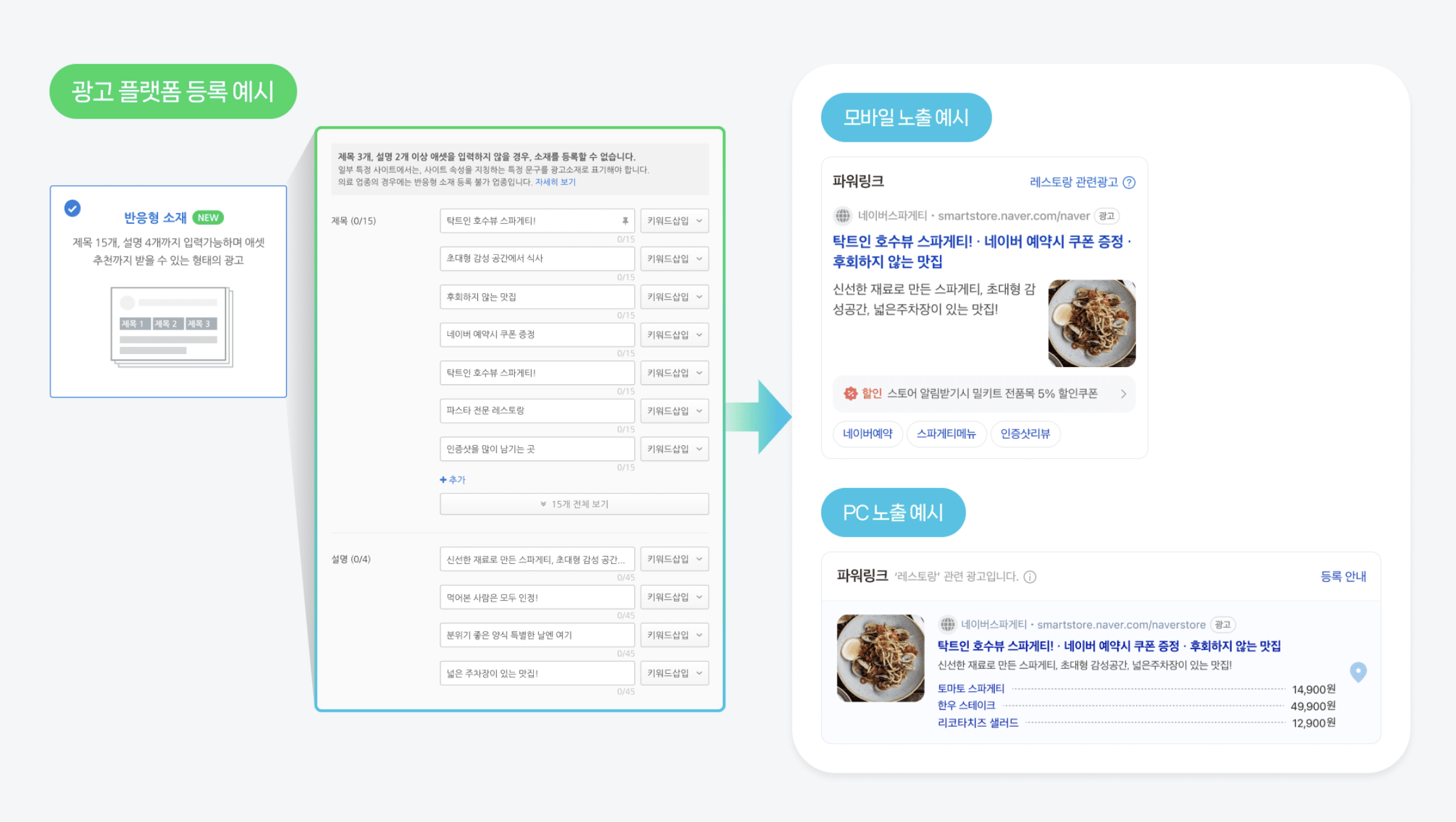반응형 소재라는 것을 적용했다고 한다. 광고주가 직접 설정한 제목과 설명 키워드가 소비자 반응에 따라 최적화되어 노출되는 형식이라는데 여러가지 제목들과 설명들을 기입해놓으면 사용자의 검색어에 해당 키워드가 포함된 경우 광고를 노출하는 시스템인 것 같다. 검색탭 영역에서 전체적으로 노출된다.