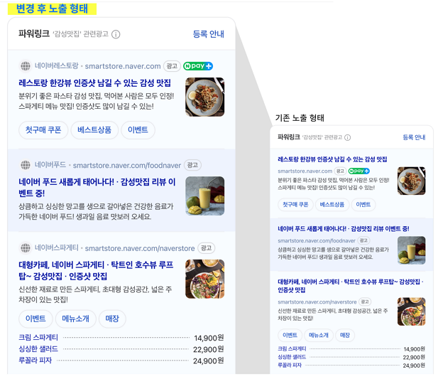 음.. 이건 이미지에 기본 노출 형태 예시가 변경 후에 비해 작게 되어 있어서 뭔가 잘 와닿진 않지만 제목과 url의 노출 순서를 변경해 가독성을 높였다고 한다. 브랜드 네임과 로고를 더 눈에 띄게 수정해서 브랜드를 더 쉽게 인식할 수 있게 했다고 하는데 내가 아직 잘 모르는 상태라 그런지 사실 무가 더 눈에 띄게 수정된건지 못 찾겠다..... 다만 url이 제목보다 위로 올라가고 제목을 읽은 후 바로 밑에 있는 키워드로 이어지는 것과 순서 변경으로 네이버페이 로고도 따로 분리되니 연결이 붕 뜨는 느낌에서 이어지는 듯한 느낌을 받았다.