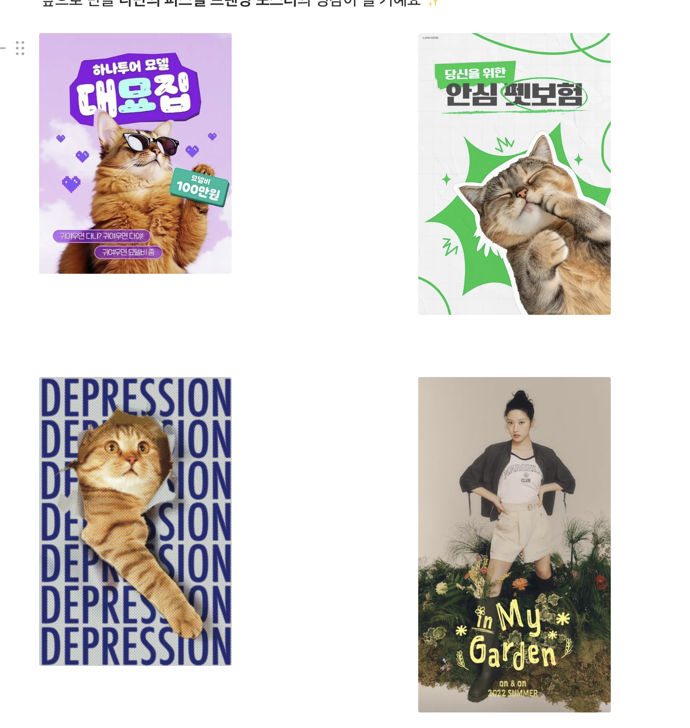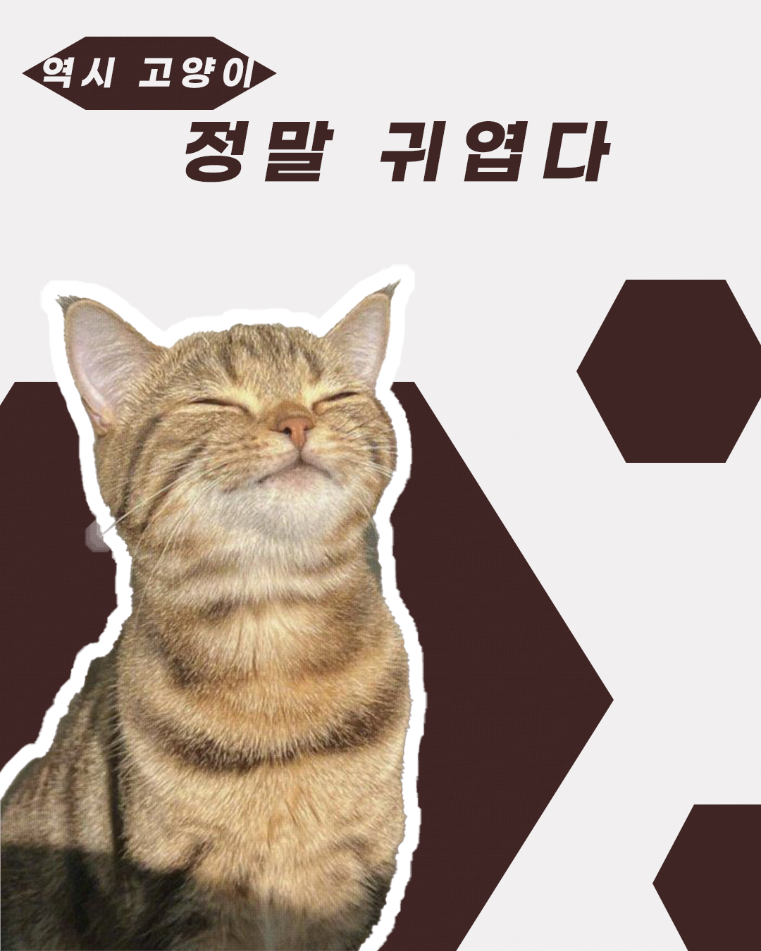 하나투어 포스터와 펫보험이 끌려서 그쪽으로 많이 참고하려 했고 내 실력이 비루하다보니 펫보험을 특히 많이 참고했었다. 초록색의 터지는 말풍선 같은 모양도 만들어 보려고 했는데 아... 포토샵을 다루기가 어려워서 그 뒷배경 모양도 역시 고양이라는 글귀의 뒷배경도 만들지를 못했다. 이래저래 챗지피티한테 물어보기도 하면서 스스로 해결하려다보니 결국 시간이 다 되어가서 그냥 육각형으로 타협을 봤다.