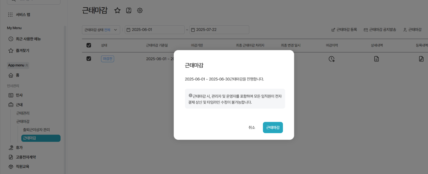 - 근태 마감 등록: '근태마감' 메뉴에서 해당 월을 선택하고 '근태 마감 등록'을 클릭합니다.