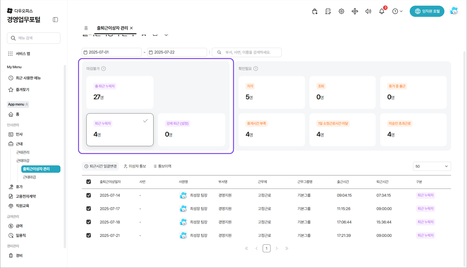 1. 첫 번째 관문: 한눈에 '근태 이상자' 확인하기!