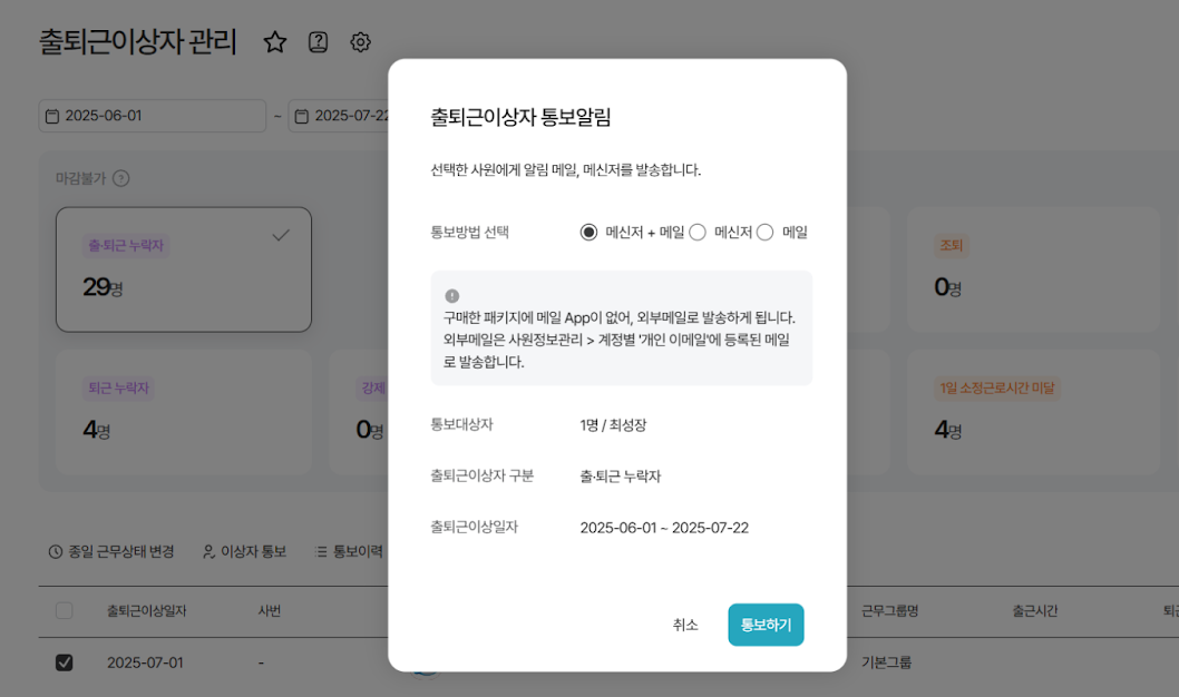 - 이상자 통보: '출퇴근이상자 관리' 목록에서 알림을 보낼 대상자를 선택합니다. 상단의 '이상자 통보' 버튼을 클릭하고 원하는 통보 방법(메신저, 메일 등)을 선택하면, 시스템이 자동으로 알림을 발송합니다.