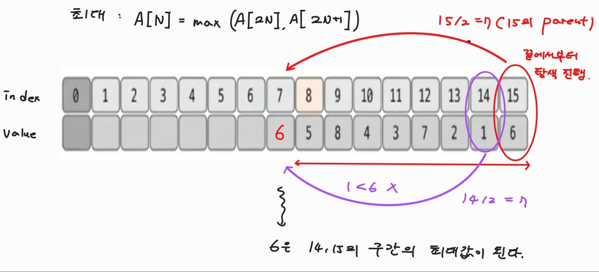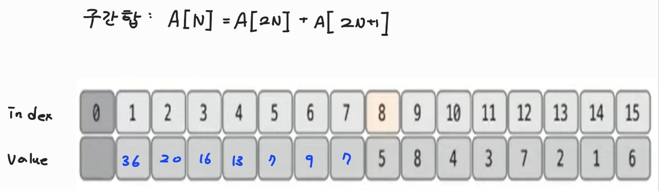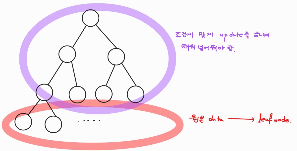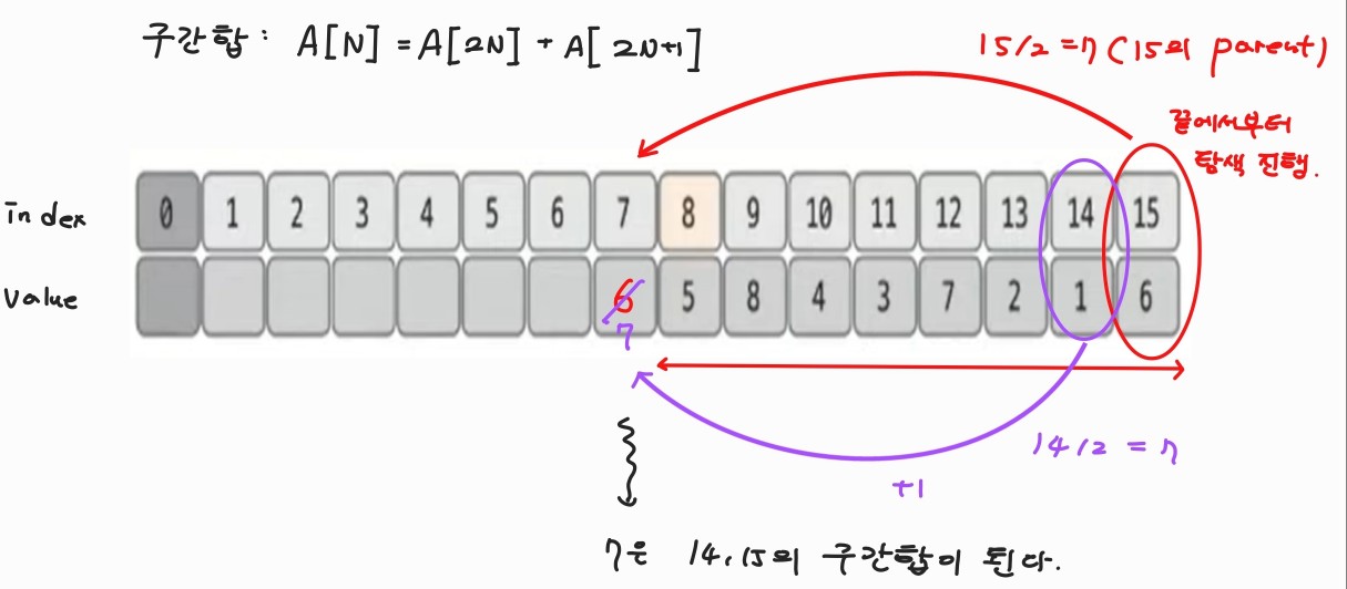 끝에서부터 탐색을 해주고, 구간 양쪽 자식의 합을 자신의 부모에 update하는 방식으로 root까지 진행한다.