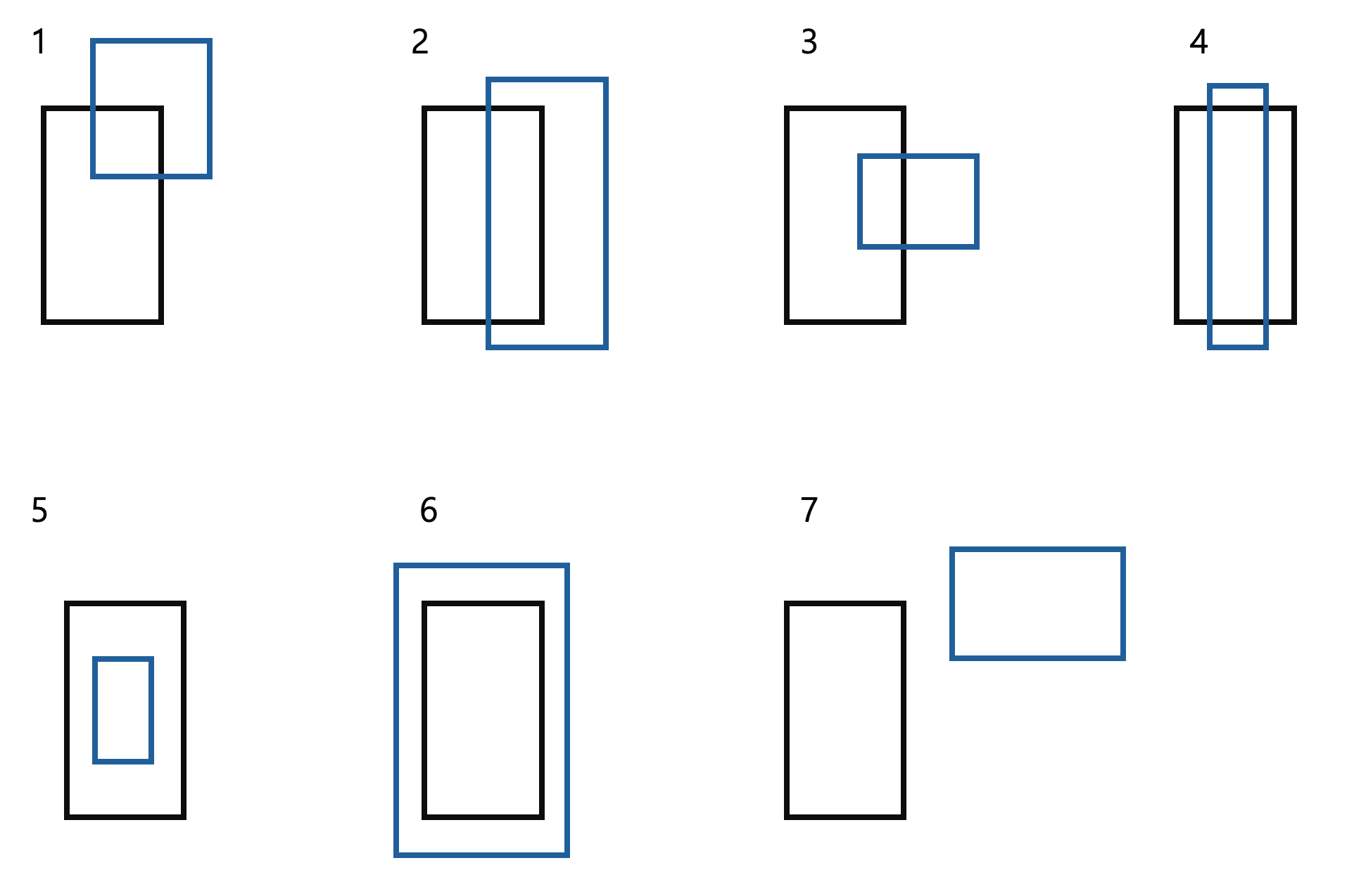 바로 2개의 사각형이 겹치는 모든 케이스에 대해 생각해야한다.
