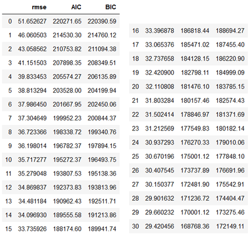 AIC(Akaike Information Criterion)는 모델 품질을 반영하는 지표로 시계열 분석에 자주 사용된다. 그것은 과적합과 과소적합 모두를 고려한다. 여러 유사한 모델을 교육할 때 모델 선택을 위해 AIC 점수를 비교할 수 있다. 일반적으로 점수가 낮을수록 좋지만 복잡성과 모델 품질 개선 사이에는 절충이 있다.