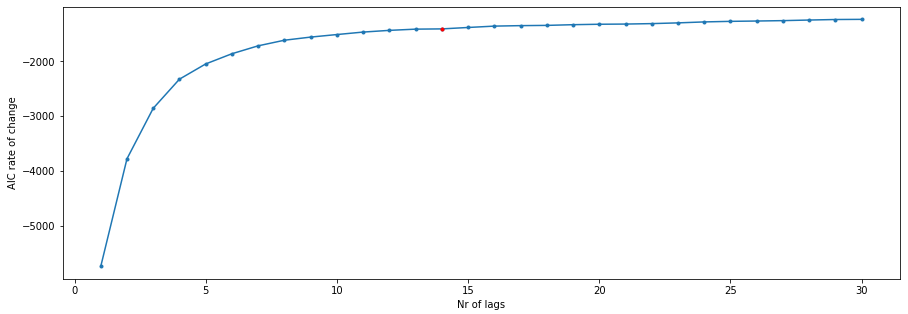 우리는 AIC가 더 많은 지연을 추가함으로써 모델 개선의 수익률을 감소시키는 티핑 포인트를 찾고 있다. 그러나 해당 표는 계속 개선되는 것처럼 보여서 명확하지 않기에 시각화를 통해 표현해보자.