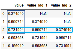pandas의 shift() 를 통해서 lagged variable을 생성. lagged column은 이전 time stamp 값들이 있다. 데이터 세트에 lag1을 추가하고 NaN 행을 drop.