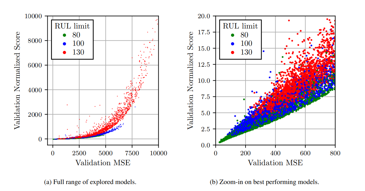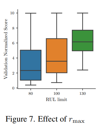 낮은 RUL limit이 MSE와 score을 낮출 수 있음을 보여준다. 이것은 예측 정확도와 timeliness 사이의 trade-off를 보여준다. 모델이 너무 이른 예측을 하도록 강요된다면 불확실성은 높아지므로 오차가 커진다. 그러나 limit이 너무 낮으면 모델은 non-trival(사소한 예측)을 내게 된다.