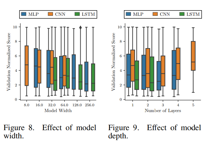 매개변수 중 특히 model width와 model depth에 관련된 효과를 보여준다. 다른 아키텍쳐들의 뉴런과 layer은 반드시 비교할 수 있지 않으며, 예를들어 LSTM 계층의 계산 비용은 같은 폭을 가진 MLP보다 높다. 각 아키텍쳐의 depth와 width는 모델을 사소한 솔루션(과적합 또는 과소적합이 아님)으로 수렴하고 훈련 시간을 비슷하게(계산 시간의 공정한 분할) 만드는 방법으로 손으로 선택되었다.