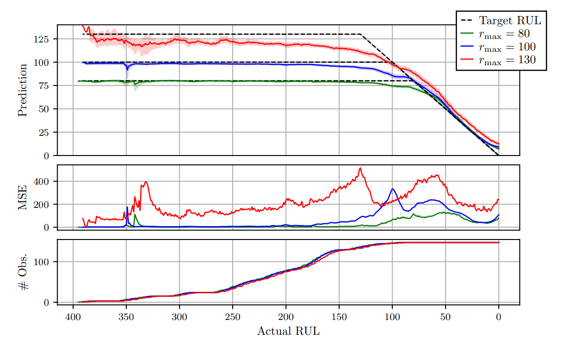 constant target regime에서의 더 큰 rmax 값에 대한 RUL 예측은 상당히 과소평가되는 경향이 있는데, 지연 예측을 penalize하는 asymmetrical loss function과 이른 성능 저하 상태에 대한 큰 불확실의 결과이다.
