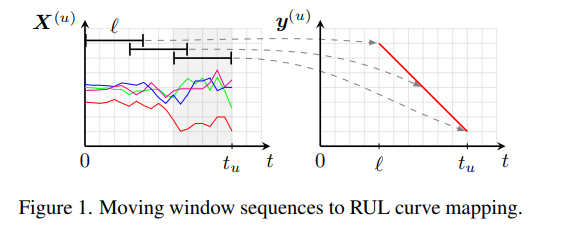 l 길이의 window로 u-th 엔진에서 시계열 경과에 따라 선형적으로 감소하는 RUL(스칼라 y)을 나타냄.