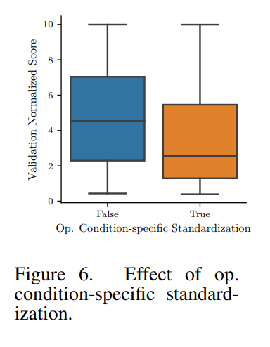 operation condition의 개별 standardization이 모든 데이터 하위 집합과 모든 모델 아키텍처에서 집계된 유효성 검사 결과에 미치는 영향을 보여준다. 평균적으로 정규화된 점수는 이 방법이 쓰일때 더 낮아지는 경향이 있으며, 여러 작동 조건을 가진 집합에서 더 나은 결과를 보여준다.