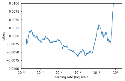 또 다른 방법은 loss의 변화율 (iteration에 대한 loss 함수의 미분)을 계산하는 것. 그래프의 노이즈를 감소시켜보면, 최소값을 찾을 수 있다. 즉 lr = 0.01 쯤.