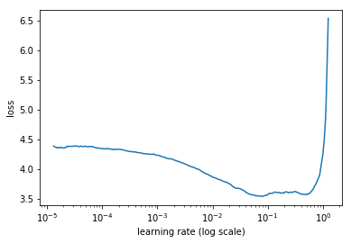 lr이 낮을때는 loss가 천천히 향상되다가, lr이 커지고 loss가 커질때 학습은 가속화된다. 우리는 여기서 fastest decrease in the loss 시점을 선택해야한다. 해당 그래프에서는 0.001과 0.01 사이임.