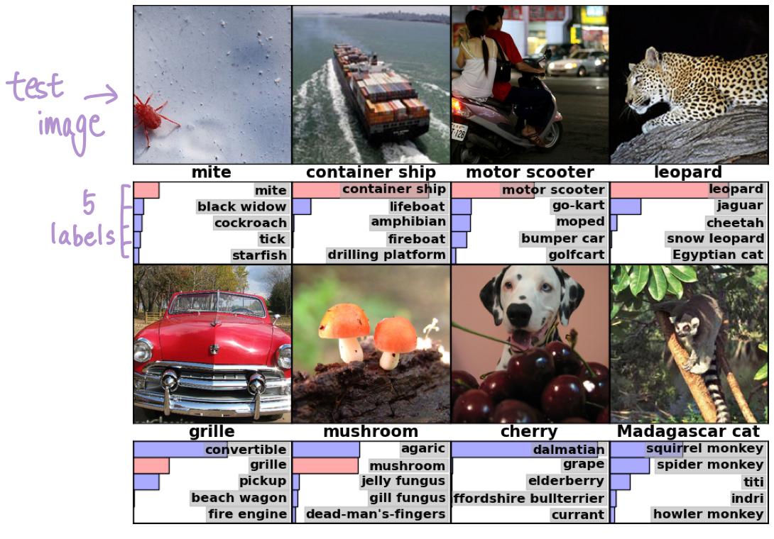 - Output : Fed to a 1000-way softmax which produces a distribution over the 1000 class labels