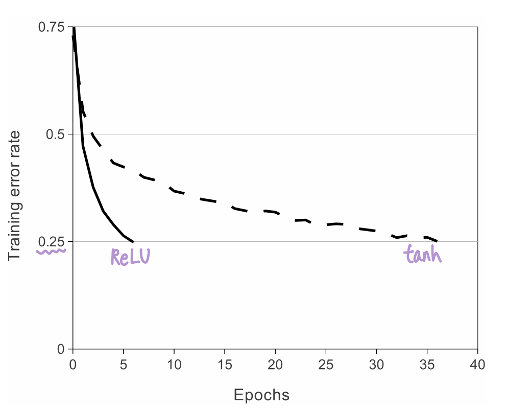Deep convolutional neural networks with ReLUs train faster than with tanh units