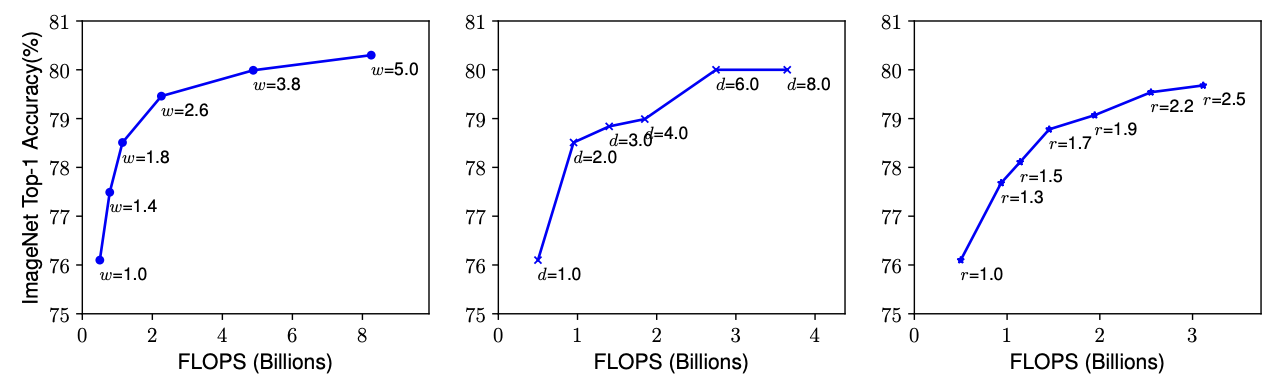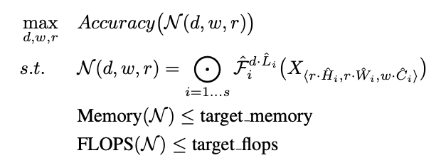 제약 조건 아래에 d,w,r이 dependent 하기 때문에 풀기 어렵다, 일반적으로 세 차원 중 하나만 scale 하는 방법이 많다.