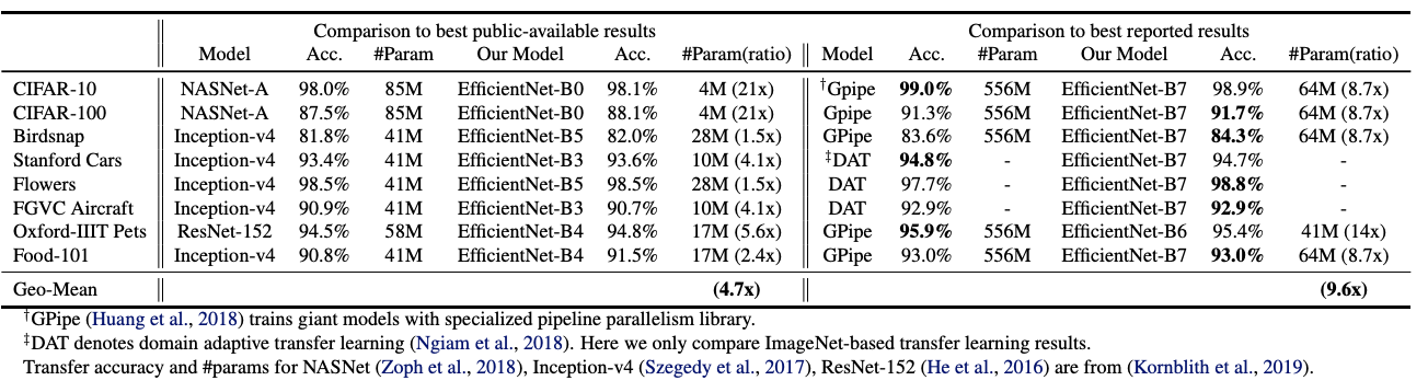 We have also evaluated our EfficientNet on a list of commonly used transfer learning datasets.