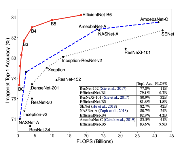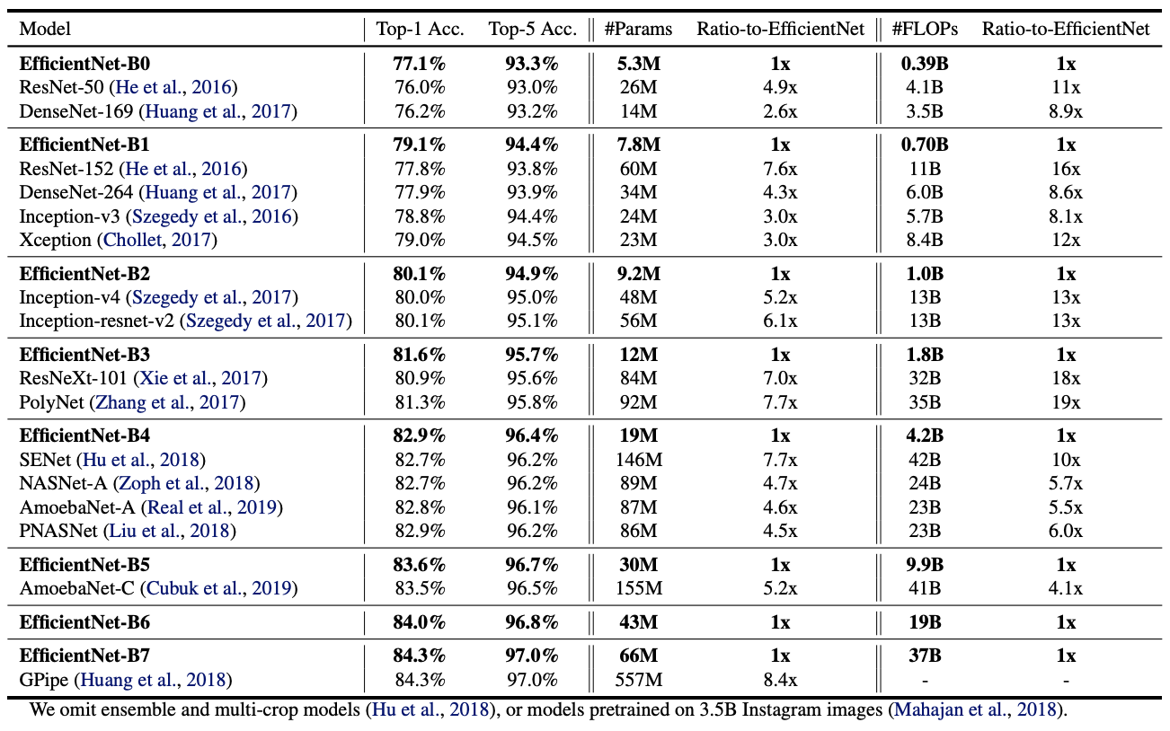 ^ Shows the performance of all EfficientNet models that are scaled from the same baseline EfficientNet-B0.