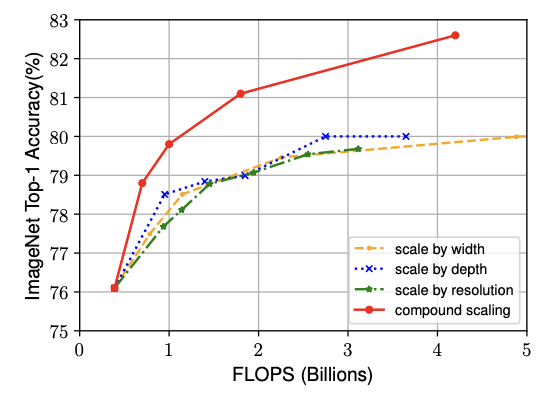 = 모델을 더 깊거나 넓게 만들거나 입력 해상도를 높이면 정확도는 올라가지만, 일정 크기 이상부터는 성능 향상이 점점 적어진다.