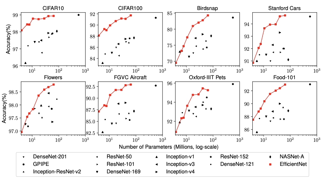 New scaling method : uniformly scales all dimensions of depth/width/resolution using a simple yet highly effective compound coefficient.