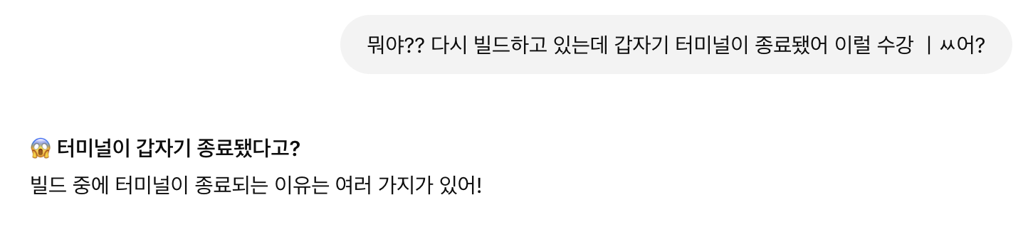 그냥 정신차리고 다시 터미널 들어가서 재빌드 시작.. 지옥의 32퍼다 진짜