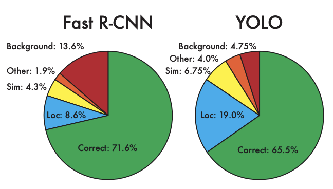 👍 YOLO makes different kinds of mistakes at test time that it is so effective at boosting Fast R-CNN's performance.