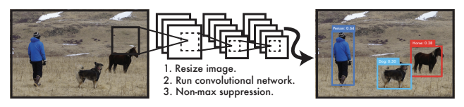 YOLO reframe object detection as a single regression problem, straight from image pixels to bounding box coordinates and class probabilities.