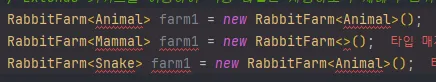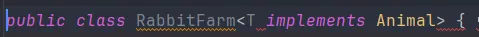 하지만 Animal까지는 필요없다. Generics 범위를 Animal이 아니라 토끼의 종 위로는 필요없다. Generics 범위를 Rabbit까지로 걸어보자. 토끼농장 RabbitFarm의 제네릭 접근 범위 상한선을 Rabbit으로 정해둔다.