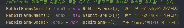 이렇게 되면, 토끼농장 클래스는 제네릭 타입을 두 가지로 받아오는 것이다. 물론 토끼농장에서 뱀을 들일 수 없겠지만, 이는 의미적으로 상속의 의미를 따로 따로 만들겠다는 것이다.