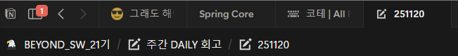 이런식으로 말이다. 강사님 노션페이지, 노트필기 페이지, 그외작업 페이지, 회고 페이지 이렇게 틀어놓으면 엄청 편하다.