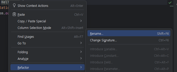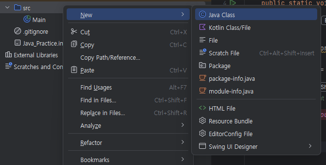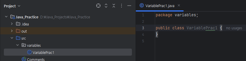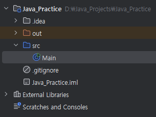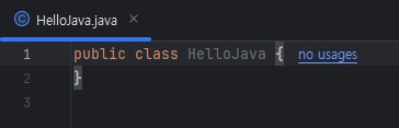 public class HelloJava {}HelloJava는 클래스 이름을 뜻합니다. 파일 이름과 똑같이 설정해줘야하는데, IntelliJ에서는 자동으로 이를 설정해줍니다.