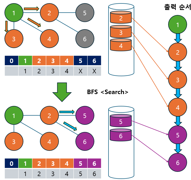 BFS 탐색 순서 : 1 -> 2 -> 3 -> 4 -> 5 -> 6