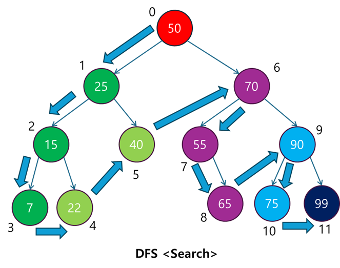 DFS | 깊이 우선 탐색 | 스택 (또는 재귀 호출) | 한 경로를 끝까지 탐색 | 최단 경로를 보장하지 않음 |