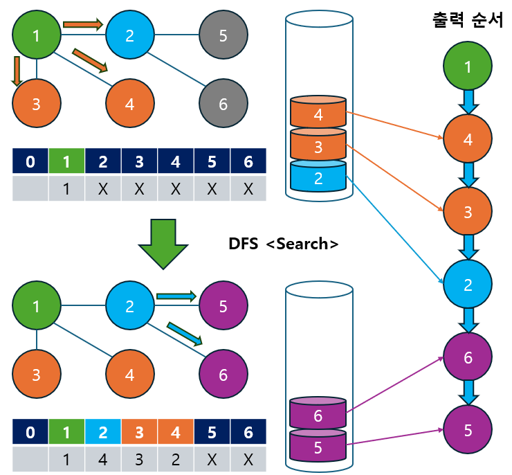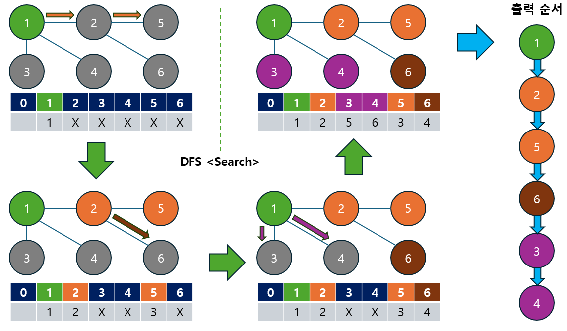 DFS 탐색 순서 : 1 -> 2 -> 5 -> 6 -> 3 -> 4